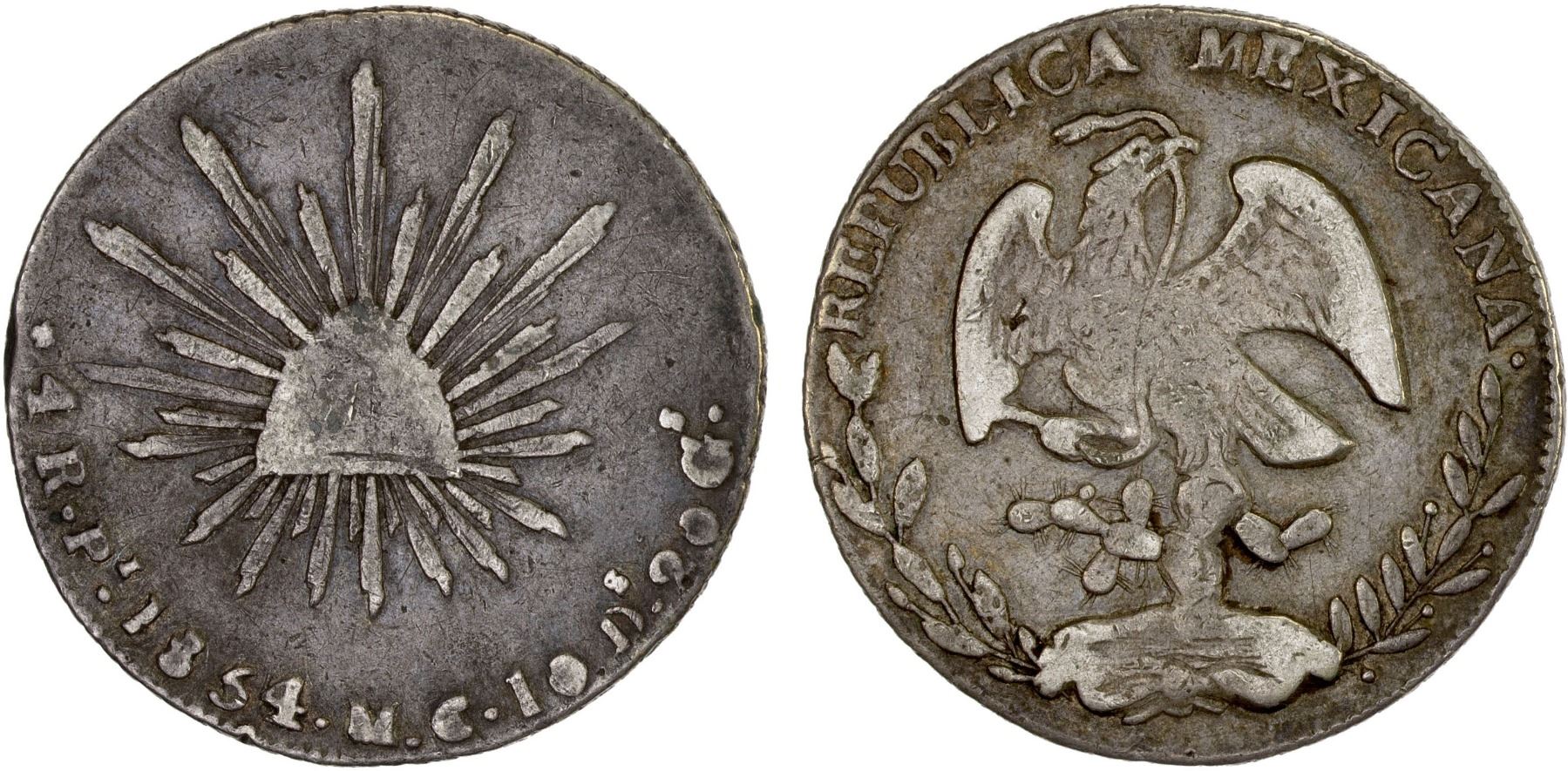 MEXICO: Republic, AR 4 reales, 1854-Pi, KM-375.8, assayer MC, better date, somewhat crude strike, tiny obverse dig, tiny reverse rim nick, rare, Fine.