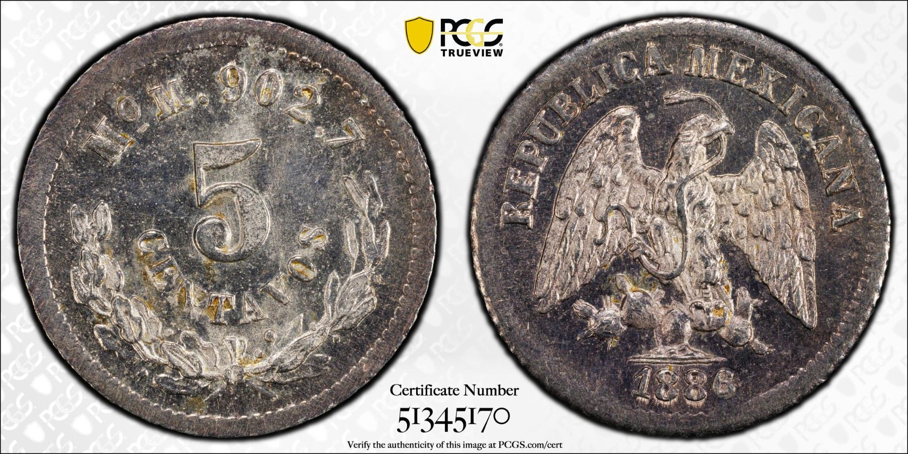 MEXICO: Republic, AR 5 centavos, 1886-Mo, KM-398.7, assayer M, a wonderful mint state example! PCGS graded MS64.