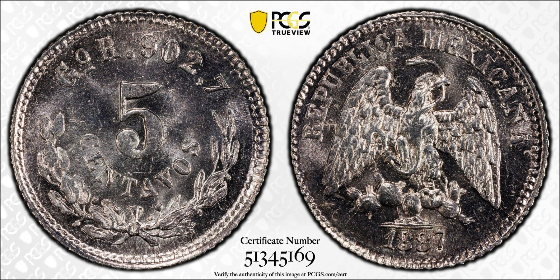 MEXICO: Republic, AR 5 centavos, 1887-Go, KM-398.5, assayer R, a superb mint state example! PCGS graded MS65.