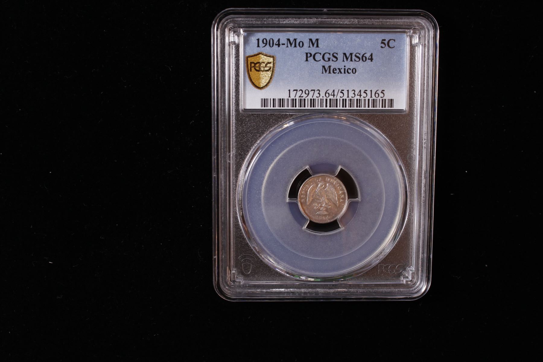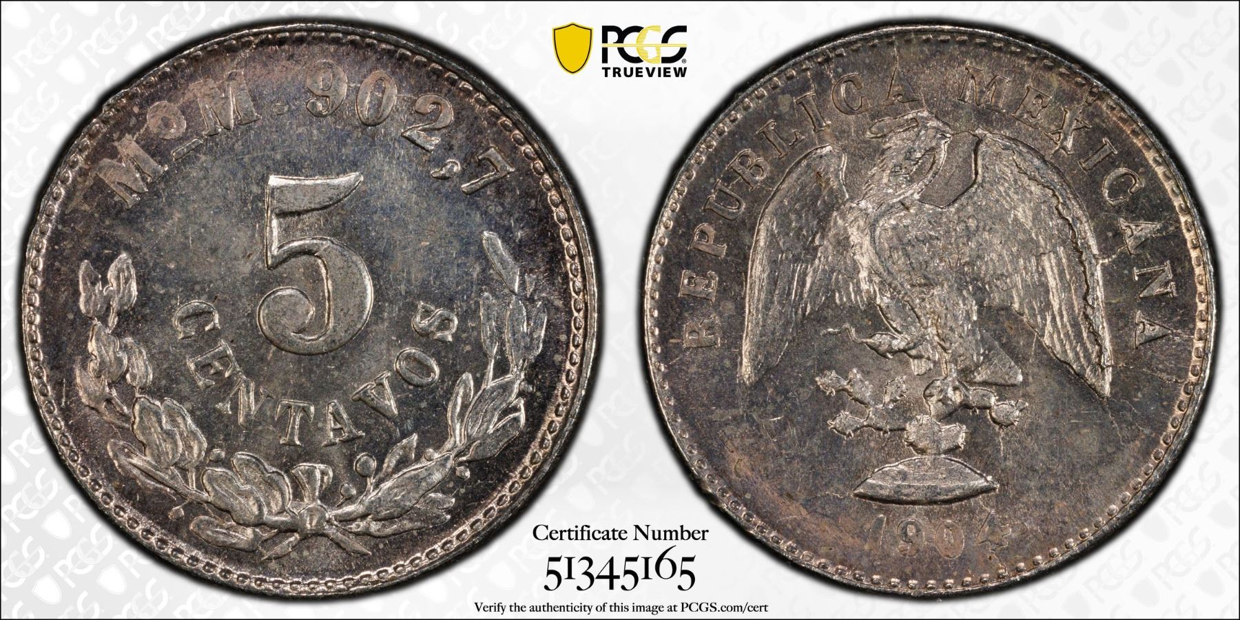 MEXICO: Republic, AR 5 centavos, 1904-Mo, KM-400.2, assayer M, a wonderful mint state example! PCGS graded MS64.