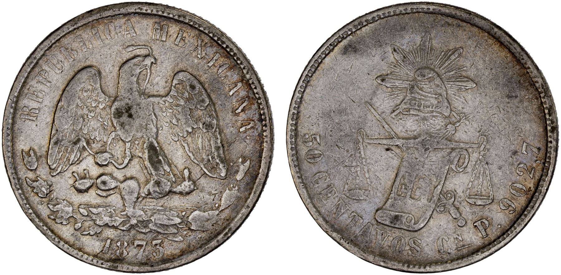 MEXICO: Republic, AR 50 centavos, 1873-Cn, KM-407.2, assayer P, rare better date, VG-F. There is a die flaw that at first glance looks like an overdate.