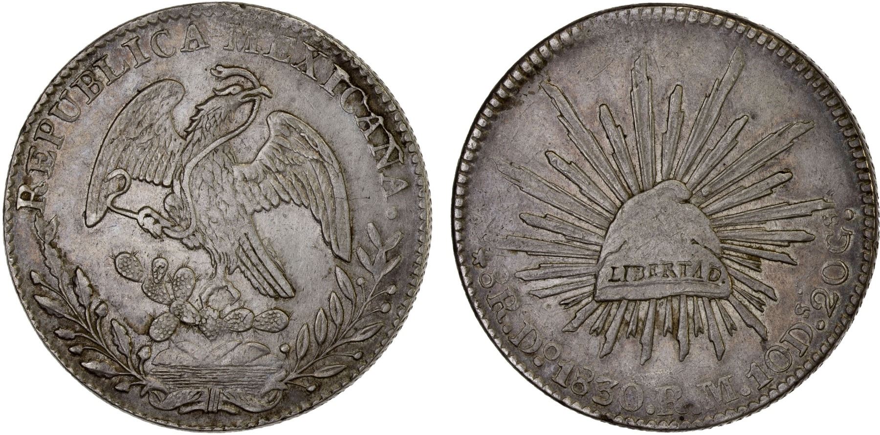 MEXICO: Republic, AR 8 reales, 1830-Do, KM-377.4, D&P-Do07, assayer RM, some doubling of cap details, second die style (1830-32), overweight, lightly cleaned, scarce date, better than usually encountered, VF-XF, ex Bob "Swamperbob" Gurney Collection.