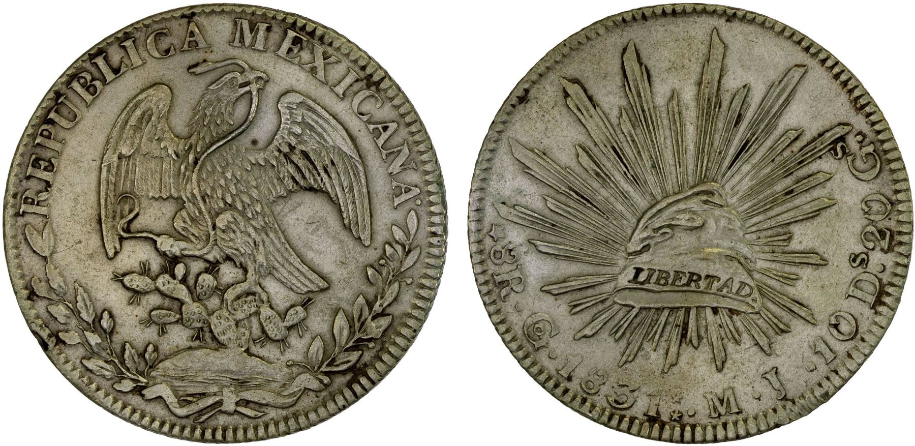 MEXICO: Republic, AR 8 reales, 1831-Go, KM-377.8, DP-Go12, Assayer MJ, Guanajuato Mint, variety with two stars after date, harshly cleaned, XF.