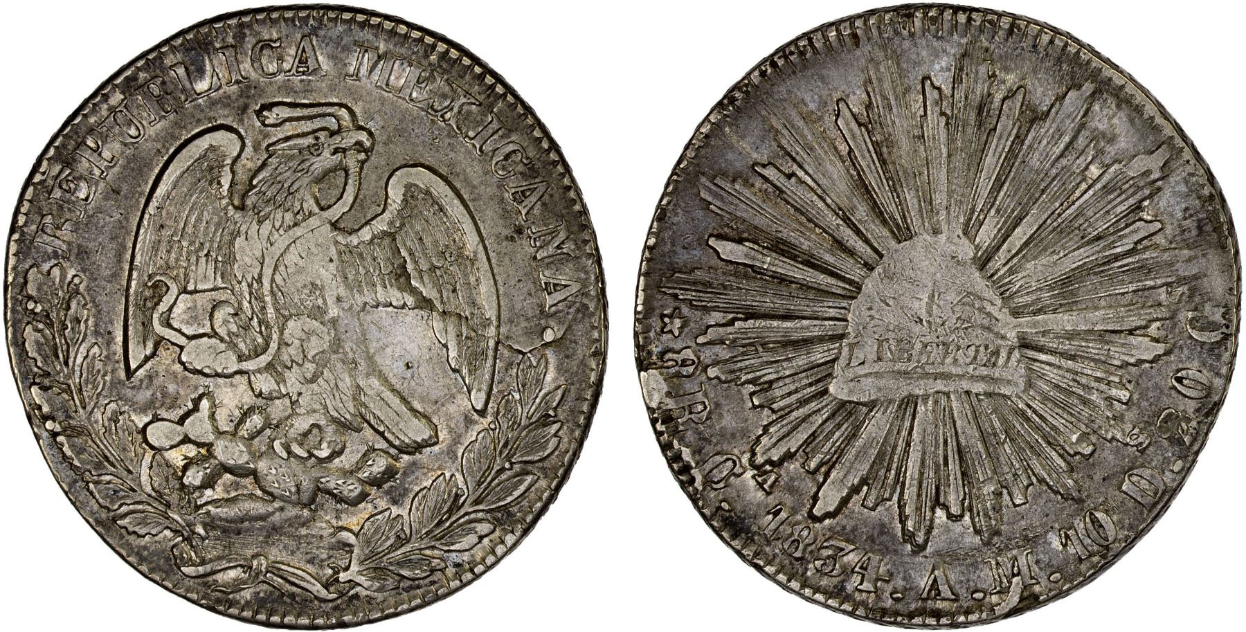 MEXICO: Republic, AR 8 reales, 1834-Ca, KM-377.2, Dunigan & Parker-Ca05, assayer AM, obverse flan flaw at 3:00, interesting flaw at "M" of assayer's initials, full legends despite small planchet, better date (rare), VF. Dunigan & Parker state that this is a rare date much more elusive than the 1833 MR.
