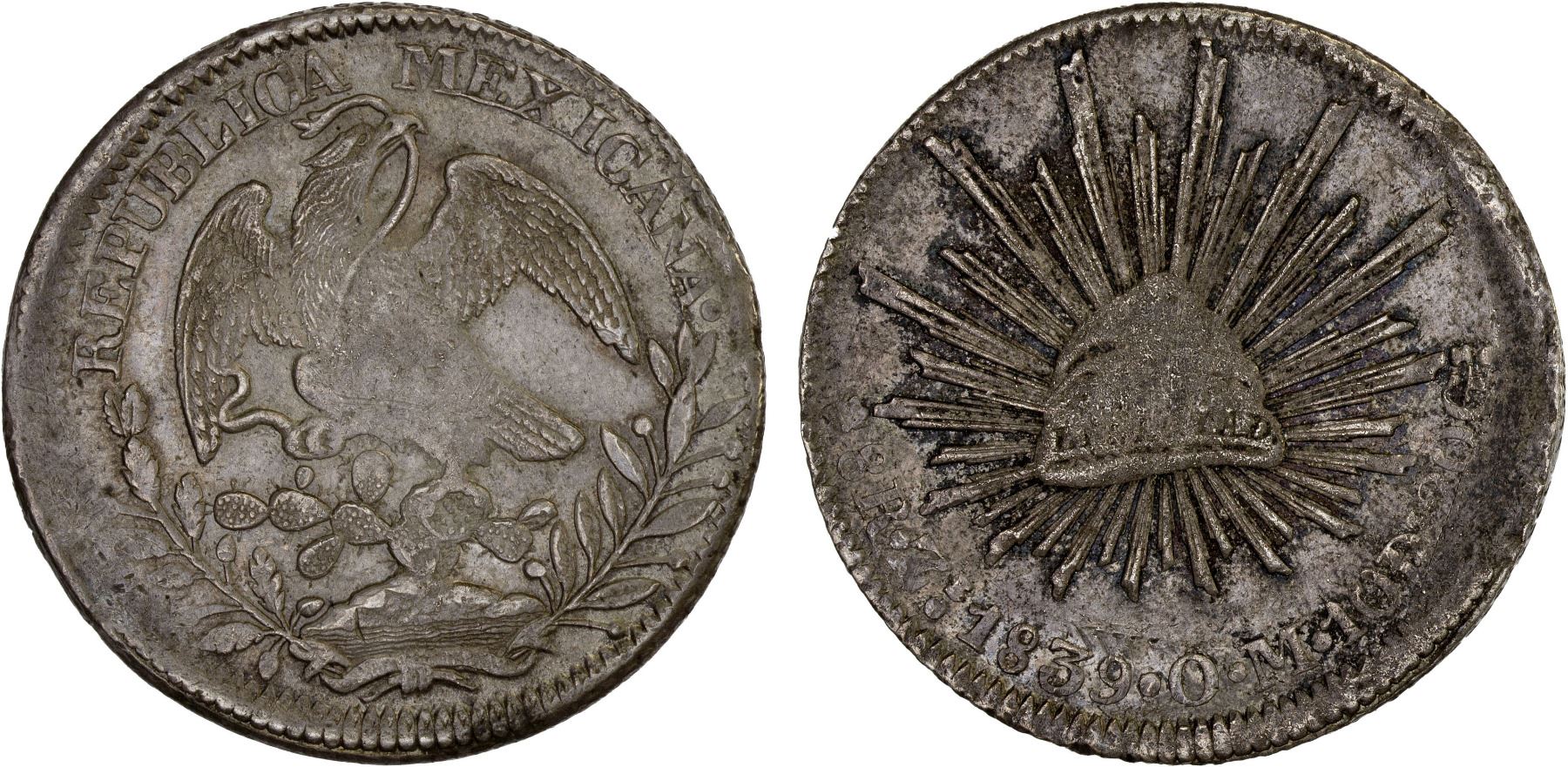 MEXICO: Republic, AR 8 reales, 1839-Zs, KM-377.13, assayer OM, toned in the rays, unevenly struck, slightly off-center, VF-XF.
