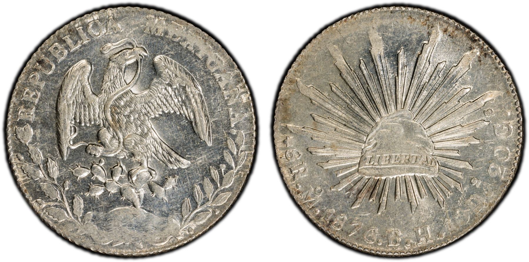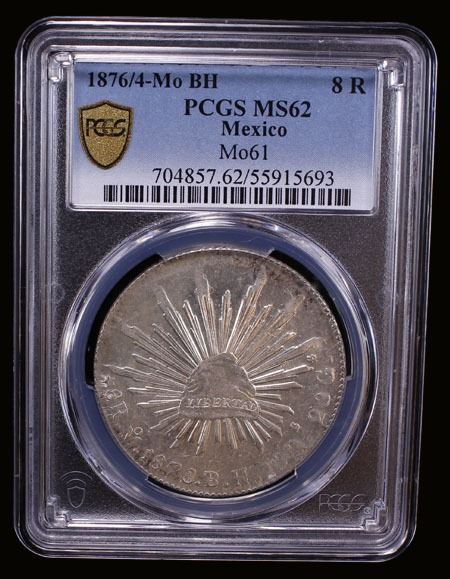 MEXICO: Republic, AR 8 reales, 1876/4-Mo, KM-377.10, DP-Mo61, assayer BH, boldly struck obverse, lovely and lustrous, PCGS graded MS62, ex Bob "Swamperbob" Gurney Collection. The single finest graded example (Top Pop) at PCGS.