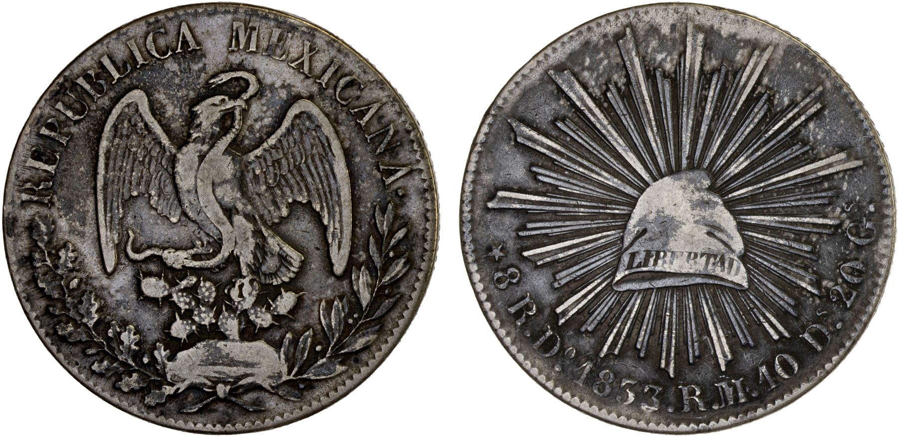MEXICO: Republic, AR 8 reales (25.57g), 1833-Do, KM-377.4, D&P-Do10, assayer RM/L, uneven deep tone, a bit scarce, VF, ex Bob "Swamperbob" Gurney Collection. The normal date, such as this piece, is scarcer than the overdate according to D&P.