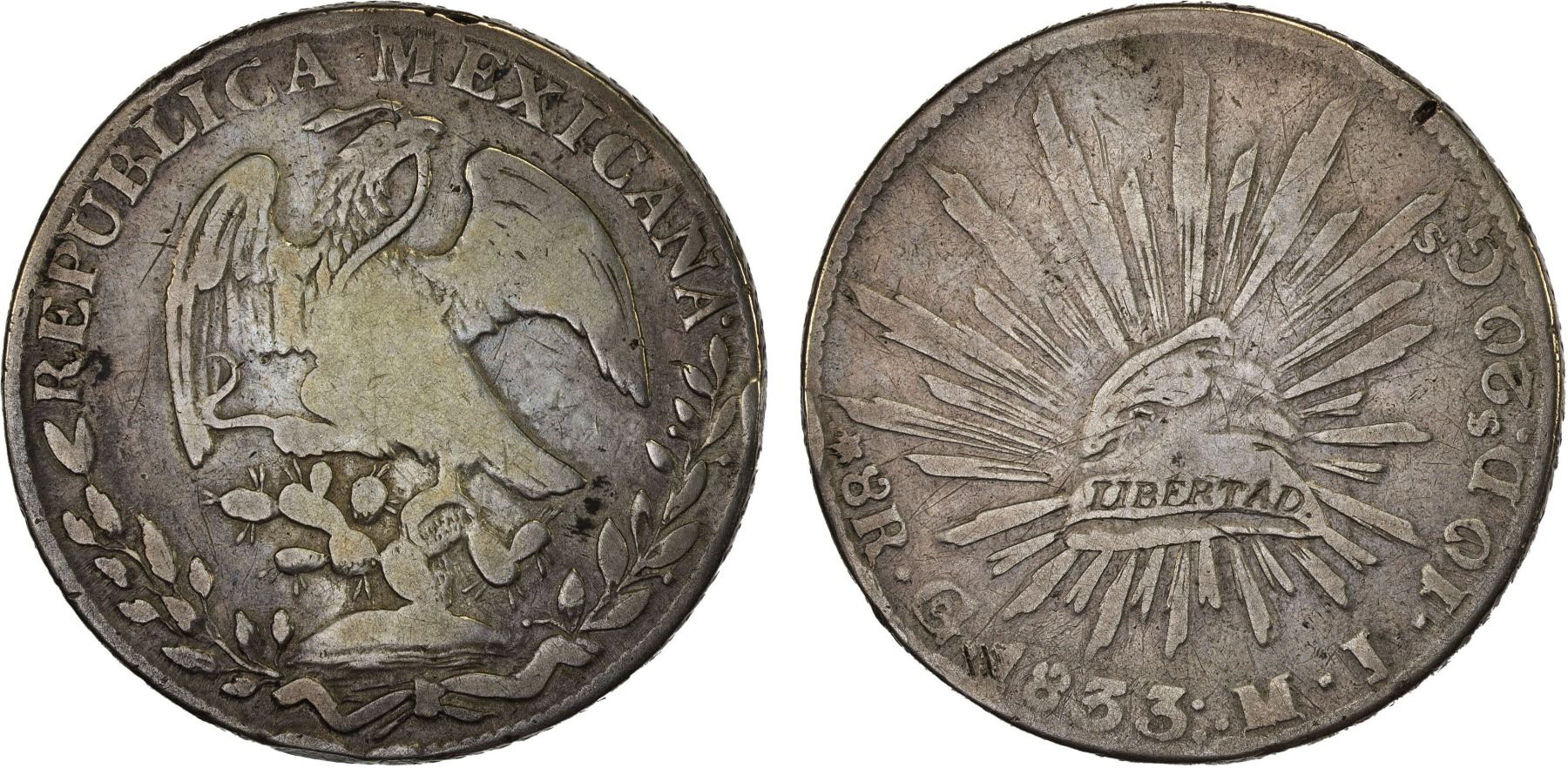 MEXICO: Republic, AR 8 reales (25.88g), 1833-Go, KM-377.8, D&P-Go14, assayer MJ, three dots after date, straight J, irregular edge, 1/1 in date, a few rim nicks, a few small scratches, VG-F, ex Bob "Swamperbob" Gurney Collection.