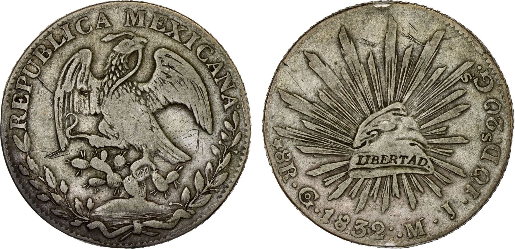 MEXICO: Republic, AR 8 reales (26.21g), 1832-Go, KM-377.8, D&P-Go13, assayer MJ, variety with 1 over inverted 1 in date; 3/3, 10/0 and Gs/s in reverse legend, some small scratches, reverse rim nick, very scarce variety, VF-XF, ex Bob "Swamperbob" Gurney Collection. The only example of this variety on CoinArchives is the host of a Philippine countermarked piece.