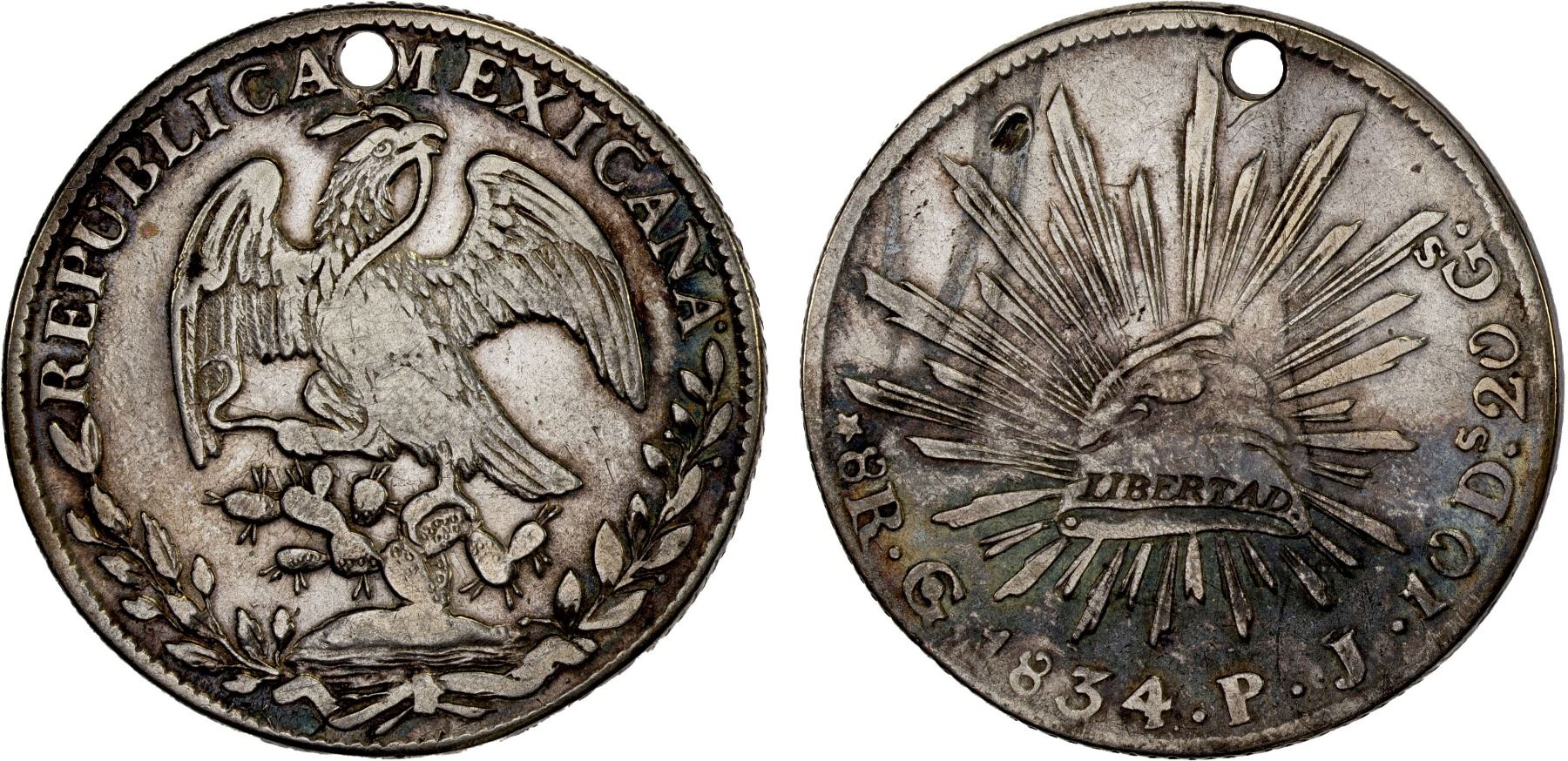 MEXICO: Republic, AR 8 reales (26.22g), 1834-Go, KM-377.8, D&P-Go16, assayer PJ, drill cancelled, irregular edge, engraved 4, reverse dig, uneven toning, F-VF, ex Bob "Swamperbob" Gurney Collection.