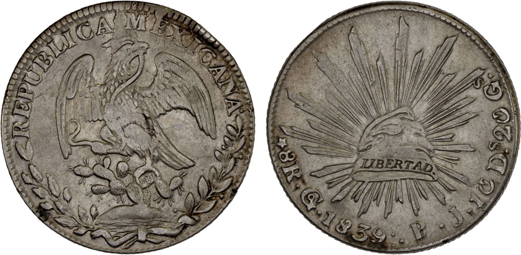 MEXICO: Republic, AR 8 reales (26.26g), Guanajuato, 1839-Go, KM-377.8, D&P-Go21, assayer PJ, lightly cleaned, very rare PJ P/J overassayer, sometimes noted as PJ/JJ, VF-XF, ex Bob "Swamperbob" Gurney Collection.