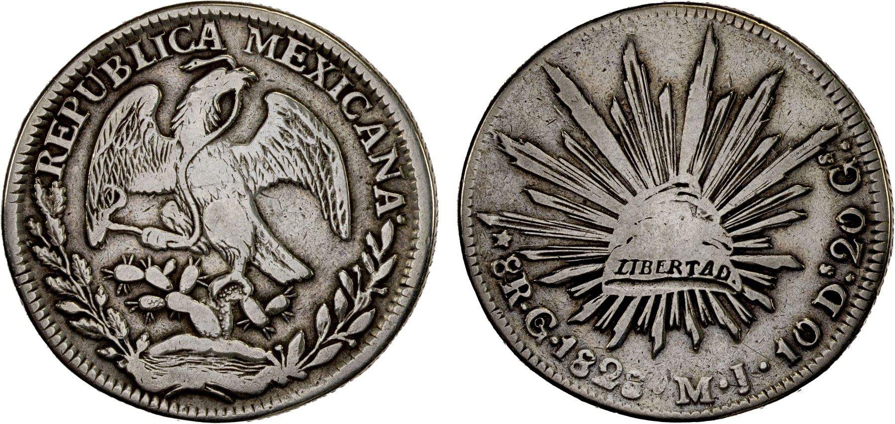MEXICO: Republic, AR 8 reales (26.44g), 1828-Go, KM-377.8, D&P-Go09, assayer MJ, striaght J, die style of 1828-29, A/A and N/N in obverse legend, small double beak, cleaned, standard matrix (32 rays), somewhat scarce, Fine, ex Bob "Swamperbob" Gurney Collection.