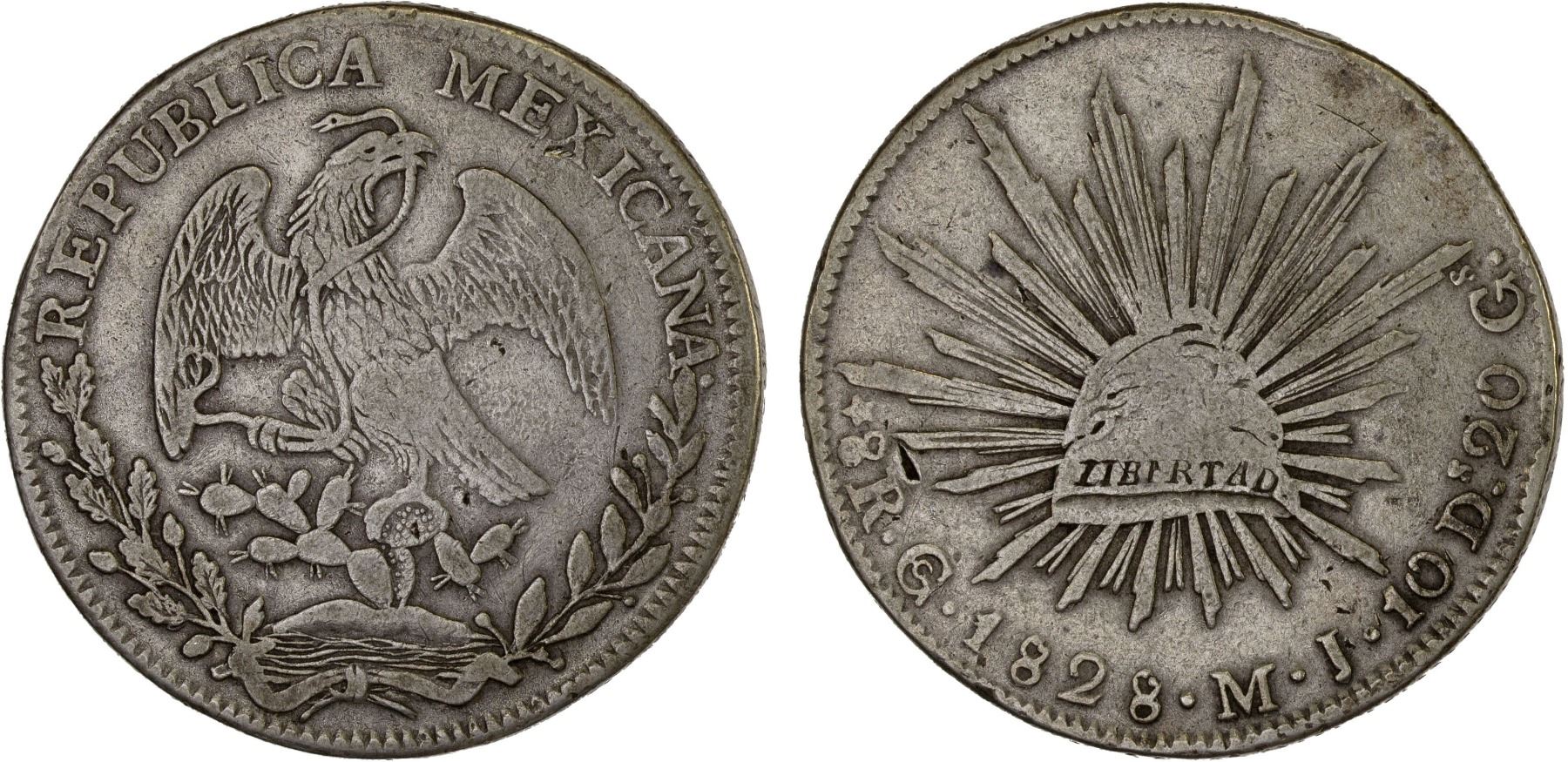 MEXICO: Republic, AR 8 reales (26.45g), 1828-Go, KM-377.8, D&P-Go09, assayer MJ, die style of 1828-29, straight J, standard matrix (32 rays), small dig over 8R, somewhat scarce, F-VF, ex Bob "Swamperbob" Gurney Collection.