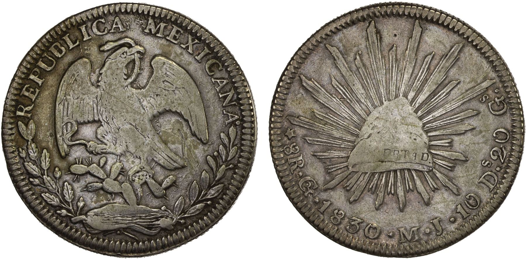 MEXICO: Republic, AR 8 reales (26.45g), 1830-Go, KM-377.8, D&P-Go11, assayer MJ, die style of 1829-30, a few scratches, standard matrix (32 rays), somewhat soft centers, VF, ex Bob "Swamperbob" Gurney Collection.