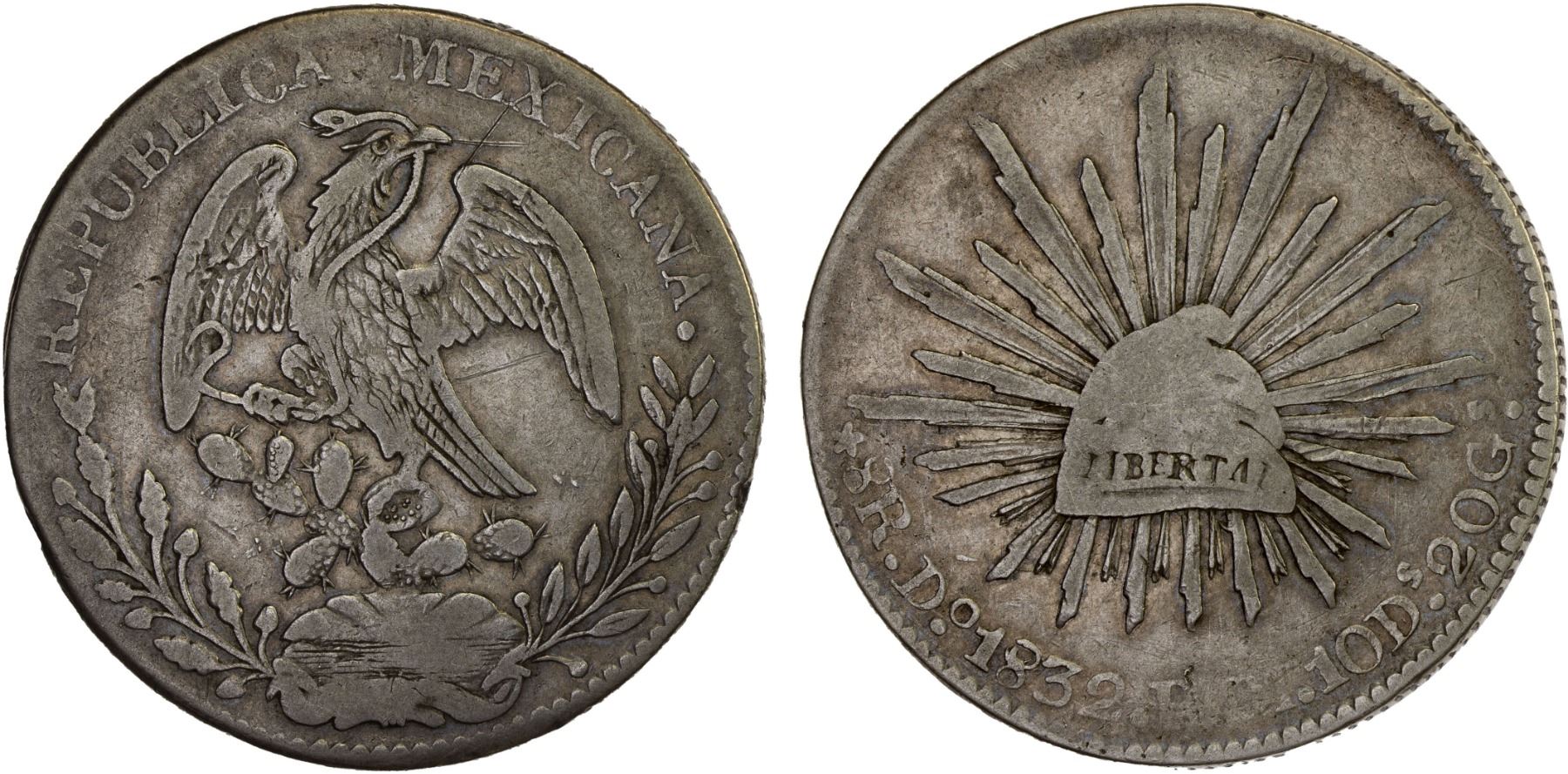 MEXICO: Republic, AR 8 reales (26.45g), 1832-Do, KM-377.4, D&P-Do09, assayer RM, "Mexican Dies" (style of 1830-32), B on eagle's claw, C/C in REPUBLICA, somewhat weak rims, rare, Fine, ex Bob "Swamperbob" Gurney Collection.