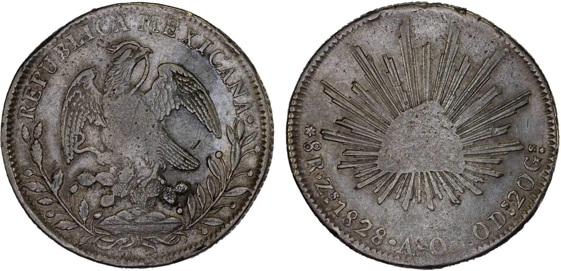 MEXICO: Republic, AR 8 reales (26.49g), 1828-Zs, KM-377.13, assayer AO, crude edges, weak centers, somewhat scarce date/mintmark/assayer, VF-XF, ex Bob "Swamperbob" Gurney Collection.