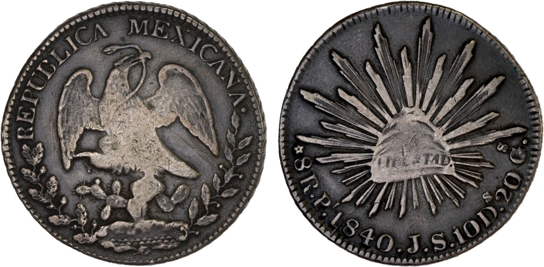 MEXICO: Republic, AR 8 reales (26.54g), 1840-Pi, KM-377.12, D&P-Pi15, assayer JS, rare variety with eagle of 1839 paired with cap of 1840, unlisted in D&P, soft centers, a few faint obverse scratches, F-VF, ex Bob "Swamperbob" Gurney Collection.