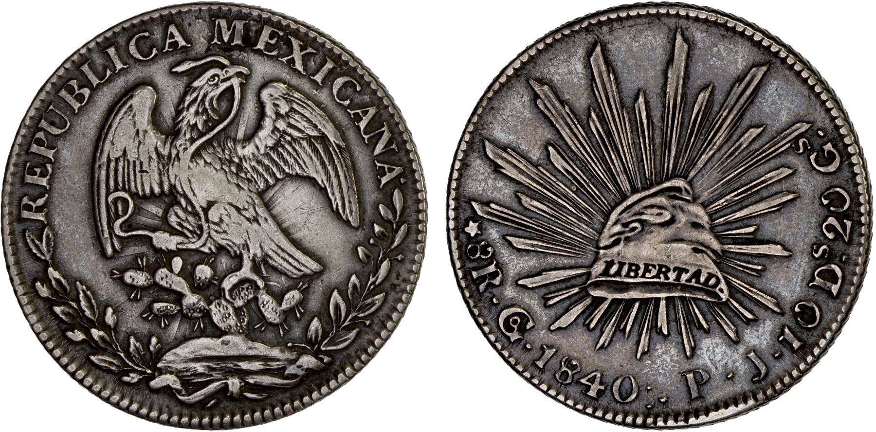 MEXICO: Republic, AR 8 reales (26.56g), Guanajuato, 1840/30-Go, KM-377.8, D&P-Go22, assayer PJ, clashed dies on obverse, toned, great strike and eye appeal, F-VF, ex Bob "Swamperbob" Gurney Collection.