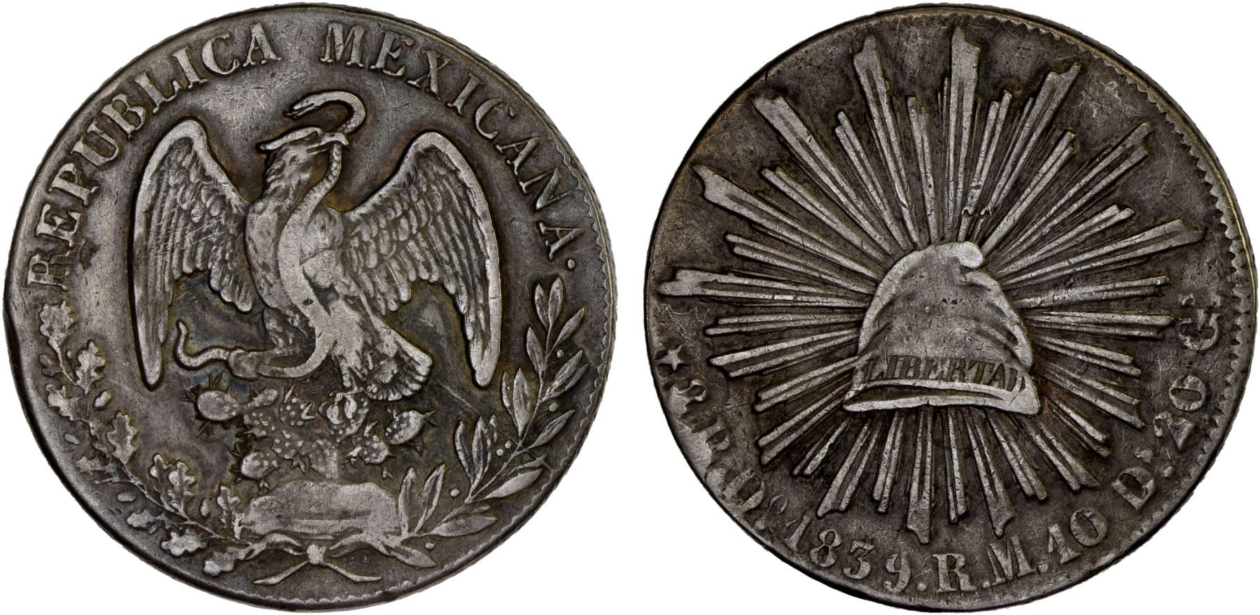 MEXICO: Republic, AR 8 reales (26.57g), 1839/1-Do, KM-377.4, D&P-Do16, assayer RM, long-crested raptor, toned, scarce variety, VF, ex Bob "Swamperbob" Gurney Collection.