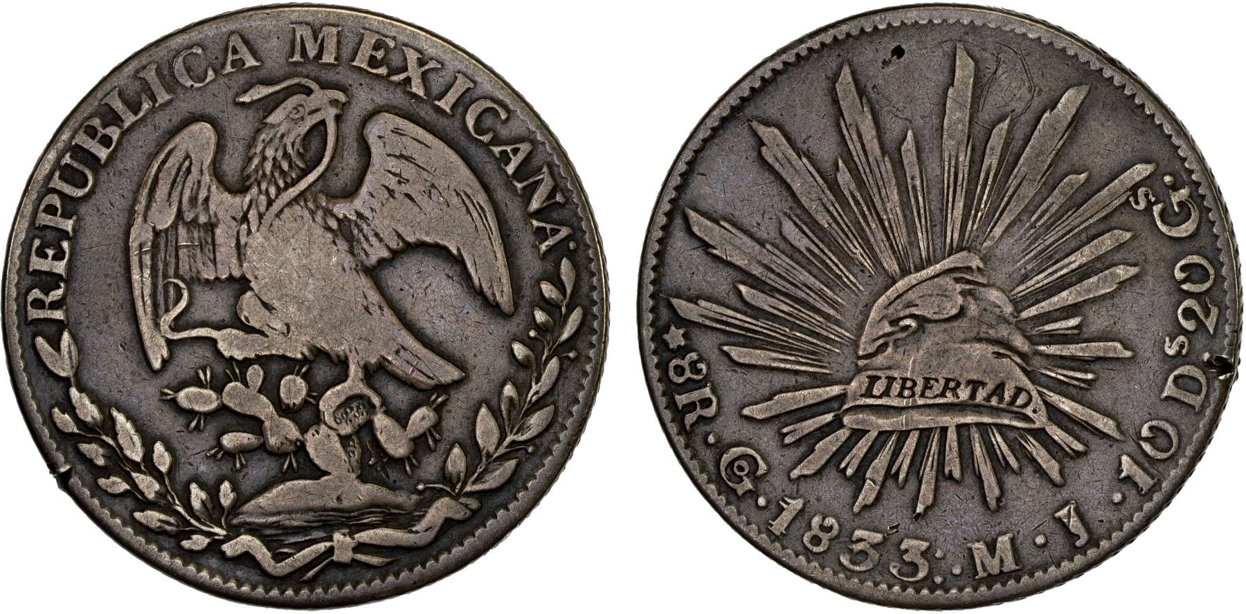 MEXICO: Republic, AR 8 reales (26.61g), 1833-Go, KM-377.8, D&P-Go14, assayer MJ, three dots after date, straight J, irregular edge, 1/1 in date, light reverse graffiti, a couple rim nicks, Fine, ex Bob "Swamperbob" Gurney Collection.