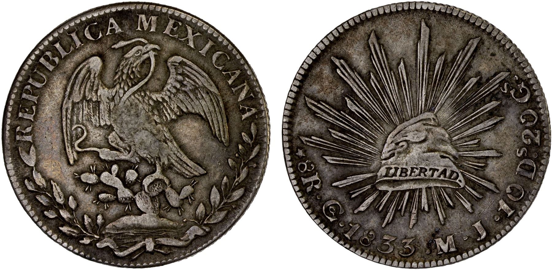MEXICO: Republic, AR 8 reales (26.63g), 1833-Go, KM-377.8, D&P-Go14, assayer MJ, three dots after date, full J, recut R in 8R, irregular edge, scarcer than the straight J variety, VF, ex Bob "Swamperbob" Gurney Collection.