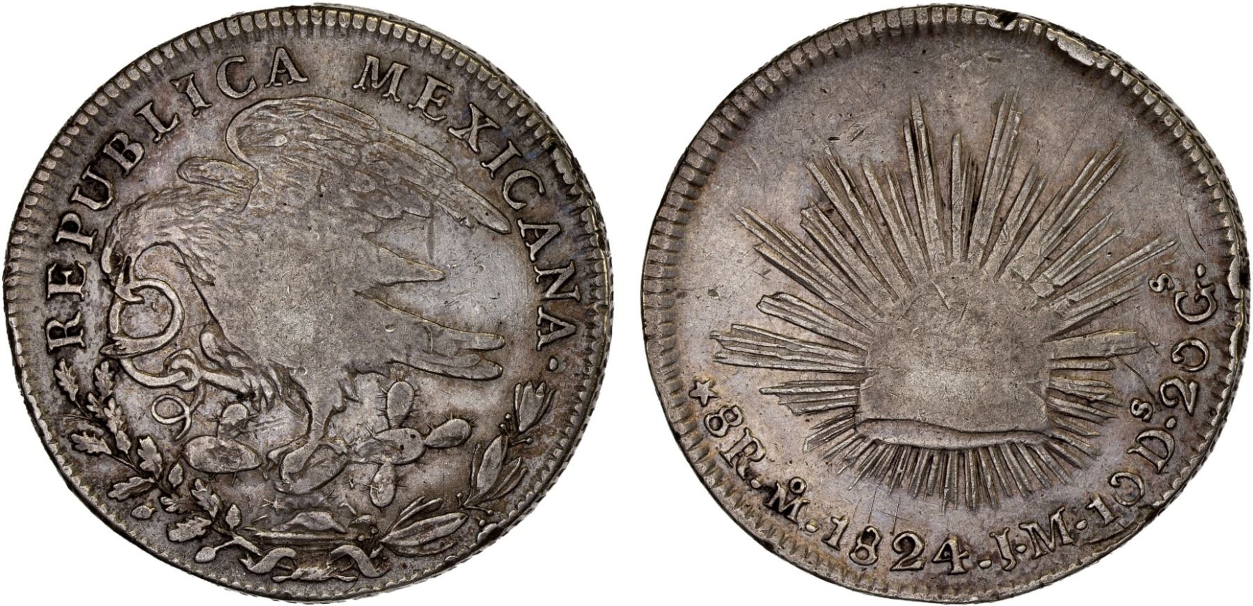 MEXICO: Republic, AR 8 reales (26.63g), Mexico City, 1824-Mo, KM-A376.2, Hubbard & O'Harrow-MO18/MR18A, D&P-Mo02, assayer JM, Hookneck type, rare variety, lightly cleaned, starting to retone, a few rim nicks, a few small reverse scratches, weak centers, F-VF, ex Bob "Swamperbob" Gurney Collection. The consignor notes that of all Hubbard & O'Harrow sales from 1968-99, this variety represented only 0.008% of all sales.