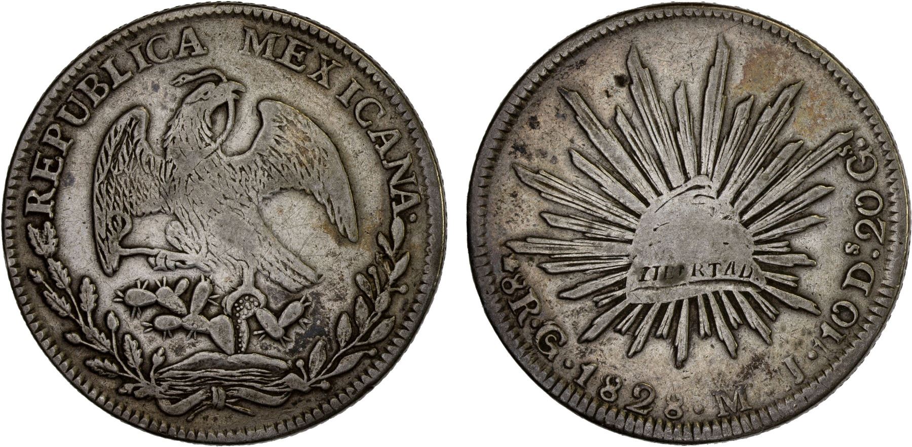 MEXICO: Republic, AR 8 reales (26.65g), 1828-Go, KM-377.8, D&P-Go09, assayer MJ/J, die style of 1828-29, straight J, J/J with much separation, "110" Ds, very unusual error legend, tiny reverse flan flaw, standard matrix (32 rays), somewhat scarce date/assayer per D&P, F-VF, ex Bob "Swamperbob" Gurney Collection. This variety appears to be unpublished and no other specimens are on CoinArchives.