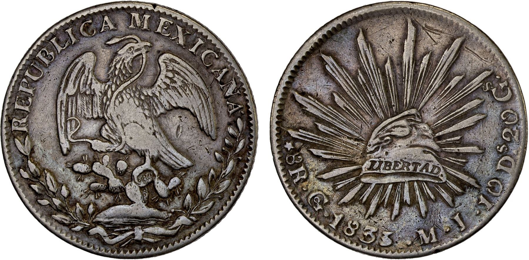 MEXICO: Republic, AR 8 reales (26.67g), 1833-Go, KM-377.8, D&P-Go14, assayer MJ, three dots after date, tiny second 3 in date, straight J; 1/10 and Gs/s in reverse legend, a few small reverse scratches, irregular edge, F-VF, ex Bob "Swamperbob" Gurney Collection.