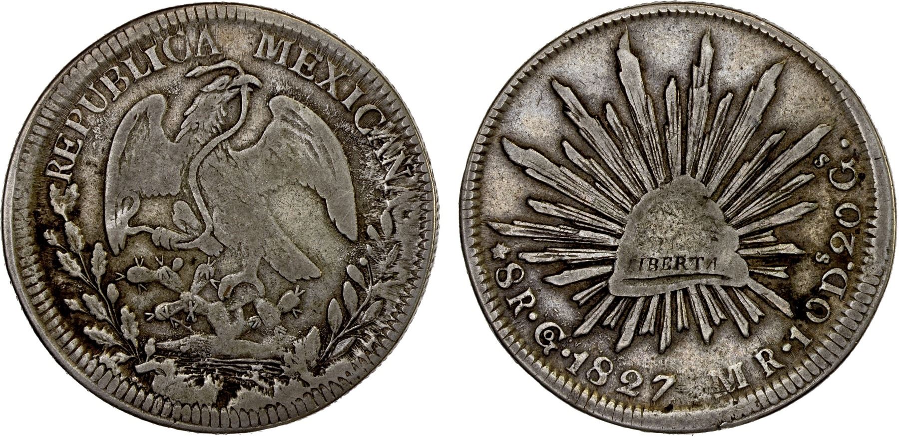 MEXICO: Republic, AR 8 reales (26.68g), 1827-Go, KM-377.8, D&P-Go07, assayer MR/R, standard old raptor, eroded obverse die, dark patch on reverse, very scarce date/assayer, much more so than the MJ assayer, Fine, ex Bob "Swamperbob" Gurney Collection.