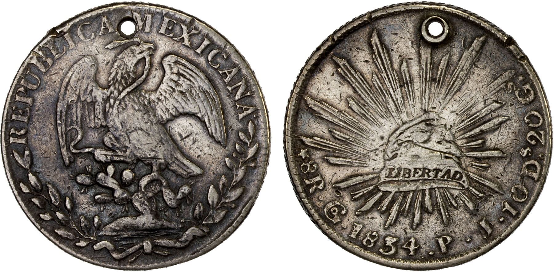 MEXICO: Republic, AR 8 reales (26.68g), 1834-Go, KM-377.8, D&P-Go16, assayer PJ, drill cancelled, irregular edge, engraved 4, lightly polished, small crimp on edge, many contact marks, VF, ex Bob "Swamperbob" Gurney Collection.