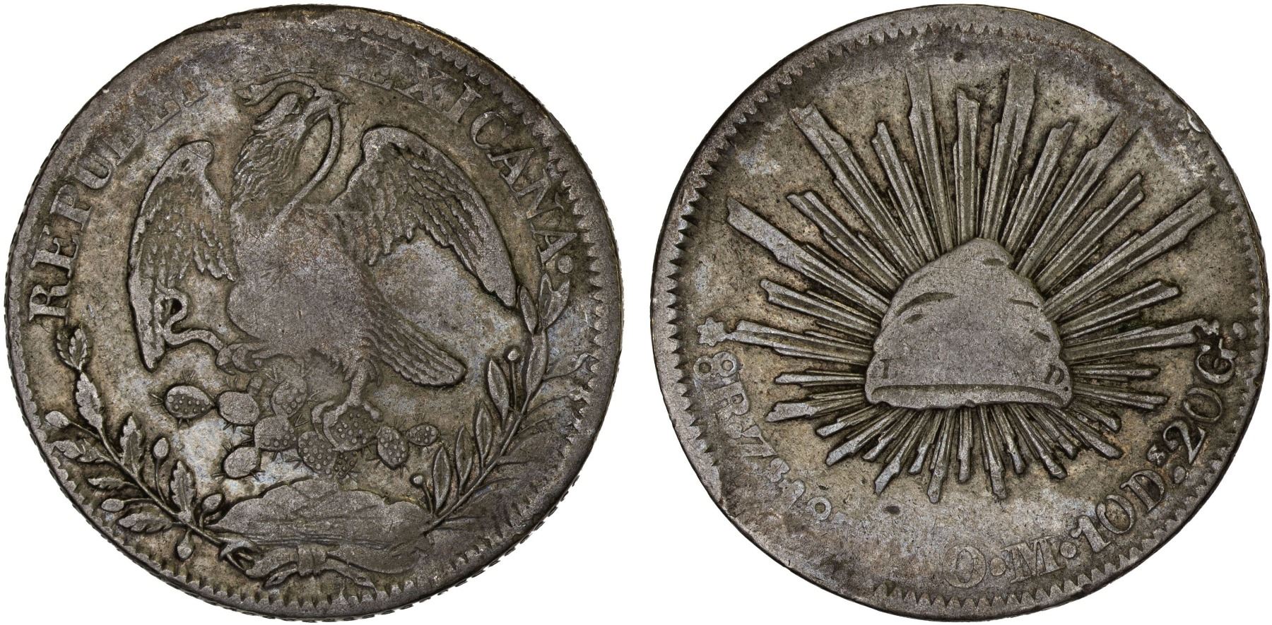 MEXICO: Republic, AR 8 reales (26.68g), 183x-Zs, KM-377.13, assayer OV, uncertain last digit of date, due to weak strike, specific gravity of 10.4, so about 1/2% gold, VF, ex Bob "Swamperbob" Gurney Collection.