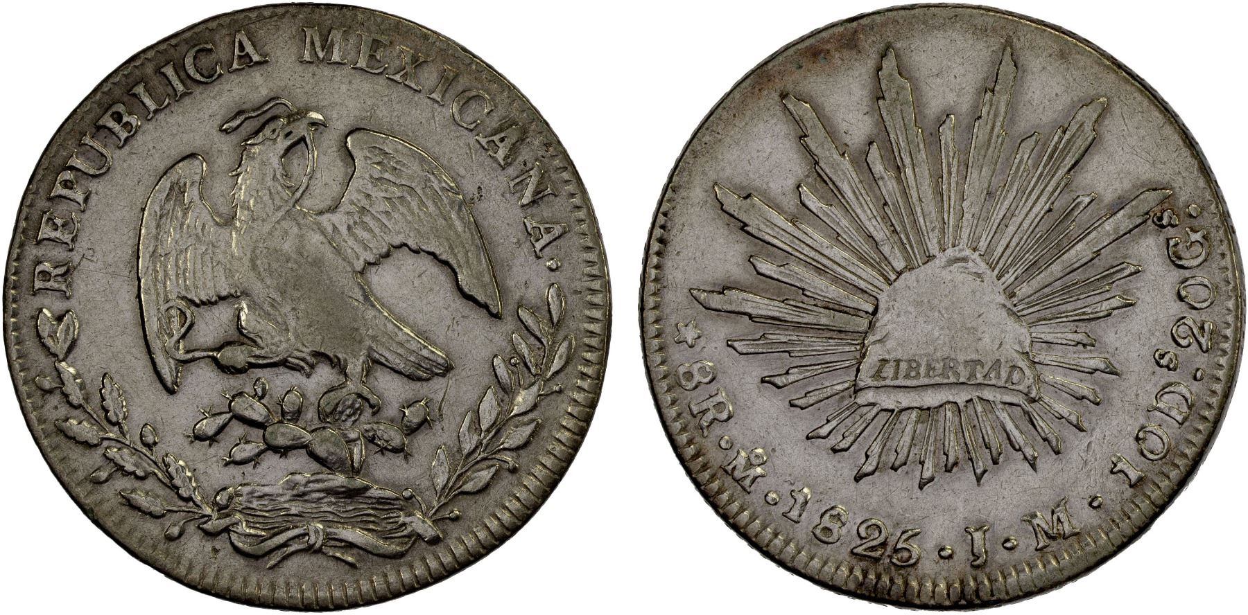 MEXICO: Republic, AR 8 reales (26.68g), Mexico City, 1825-Mo, KM-377.10, D&P-Mo04, assayer JM, lightly cleaned, first A in MEXICANA over another letter, popular date, VF, ex Bob "Swamperbob" Gurney Collection. The consignor notes that this punching error is rare and unlisted in D&P.
