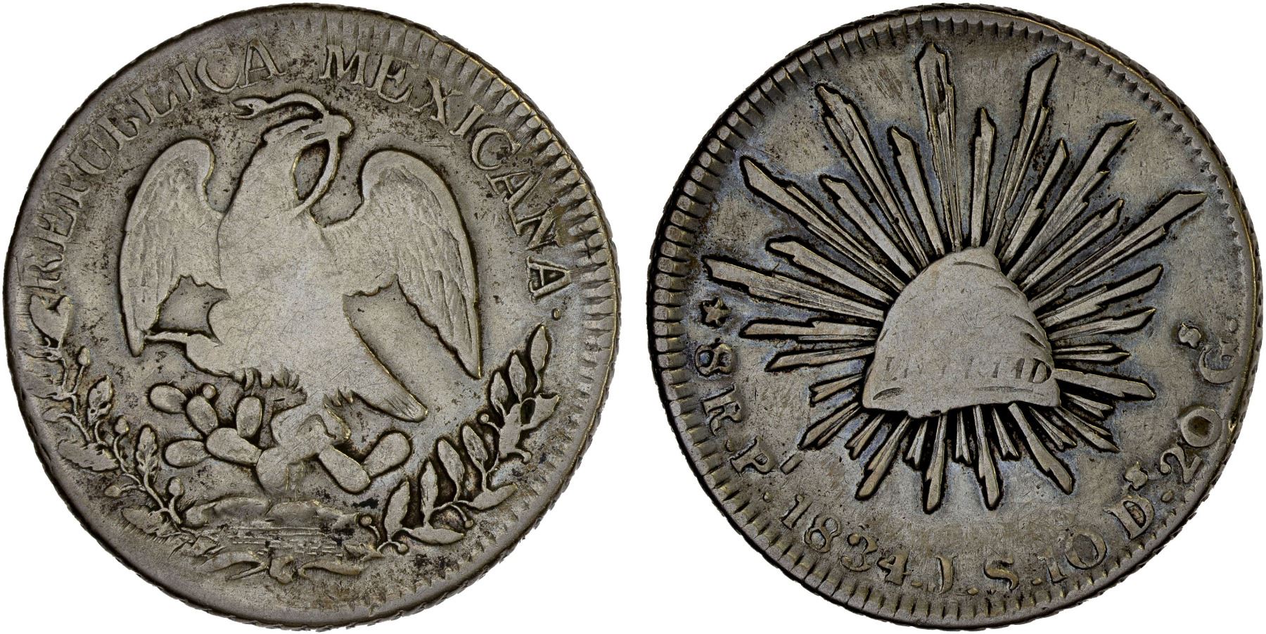 MEXICO: Republic, AR 8 reales (26.68g), San Luis Potosi, 1834/3-Pi, KM-377.12, D&P-Pi09, assayer JS, somewhat weak centers, very rare overdate, Fine, ex Bob "Swamperbob" Gurney Collection.