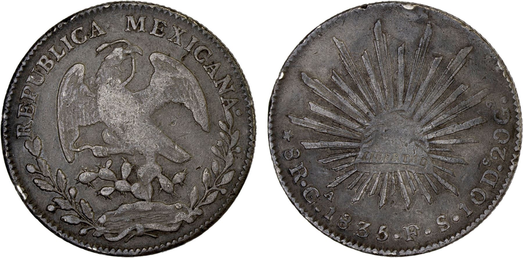 MEXICO: Republic, AR 8 reales (26.70g), Guadalajara, 1835-Ga, KM-377.6, D&P-Ga13, assayer FS, weak eagle center, some small rim nicks, toned, scarce date/assayer, VF, ex Bob "Swamperbob" Gurney Collection.