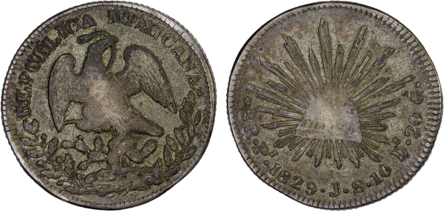 MEXICO: Republic, AR 8 reales (26.72g), San Luis Potosi, 1829-Pi, KM-377.12, D&P-Pi04, assayer JS, toned, somewhat weak centers, revised extended tail (rare, not in D&P), scarce date/assayer, VF, ex Bob "Swamperbob" Gurney Collection.