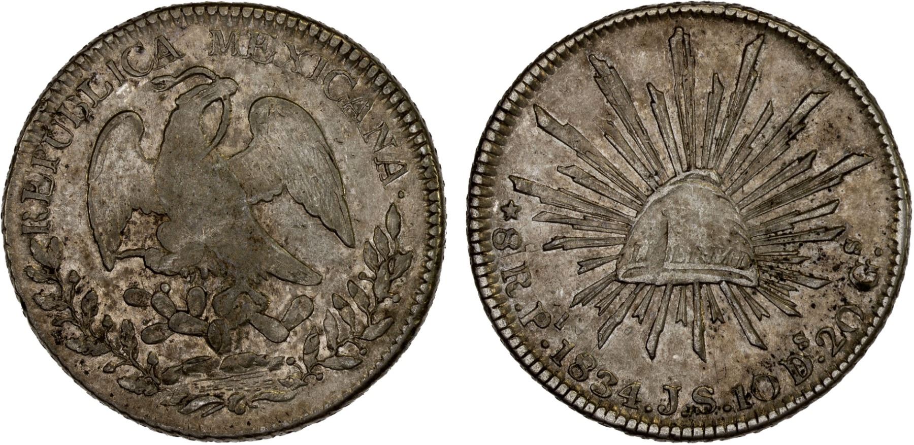 MEXICO: Republic, AR 8 reales (26.73g), San Luis Potosi, 1834-Pi, KM-377.12, D&P-Pi09, assayer JS, double struck (rare), rotated in collar, small spots on reverse, small flan flaw on cap, somewhat scarce date/assayer, XF, ex Bob "Swamperbob" Gurney Collection.