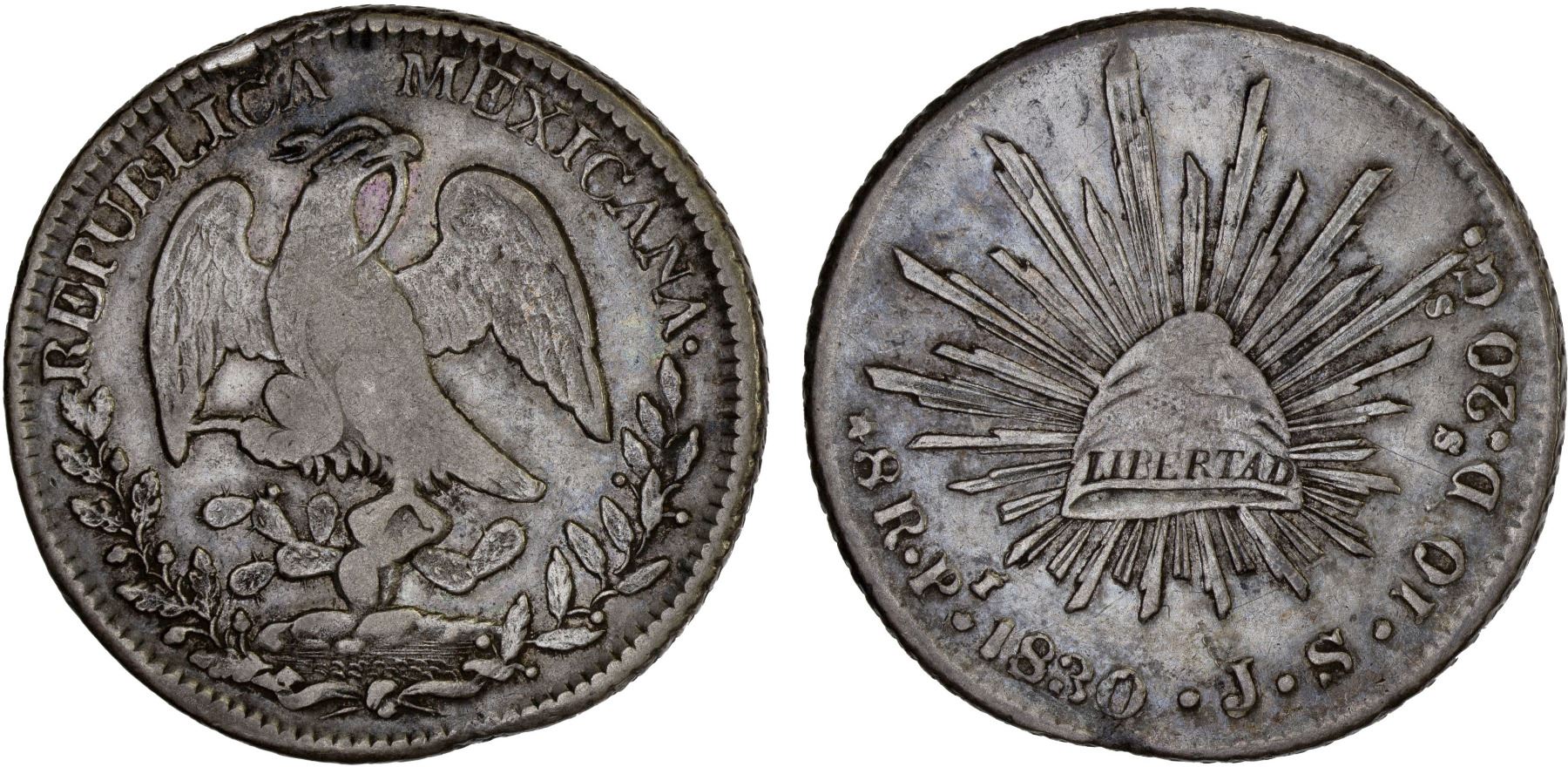 MEXICO: Republic, AR 8 reales (26.74g), San Luis Potosi, 1830-Pi, KM-377.12, D&P-Pi05, assayer JS, possible weak extra S superscript on other side of D in obverse legend (rare variant), obverse rim nick, weak eagle center, scarce date/assayer, F-VF, ex Bob "Swamperbob" Gurney Collection.