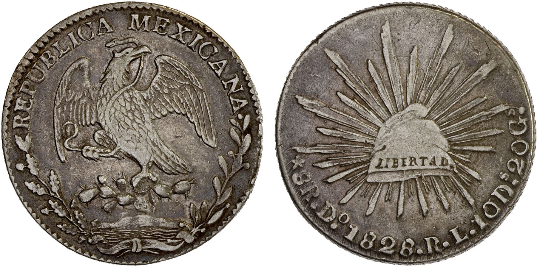 MEXICO: Republic, AR 8 reales (26.76g), Durango, 1828-Do, KM-377.4, D&P-Do05, assayer RL, 32 rays, cactus pad pattern 6/3/2, scarce date/assayer, F-VF, ex Bob "Swamperbob" Gurney Collection.