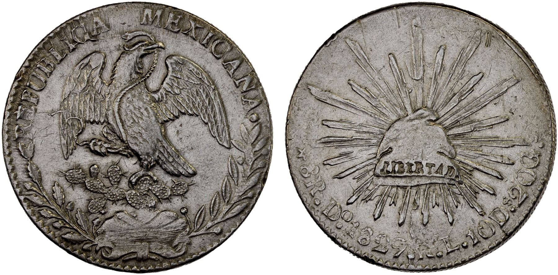 MEXICO: Republic, AR 8 reales (26.77g), Durango, 1829-Do, KM-377.4, D&P-Do06, assayer RL, 32 rays, cactus pad pattern 7/3/2, small reverse dig, lightly cleaned, scarce date/assayer, XF, ex Bob "Swamperbob" Gurney Collection.