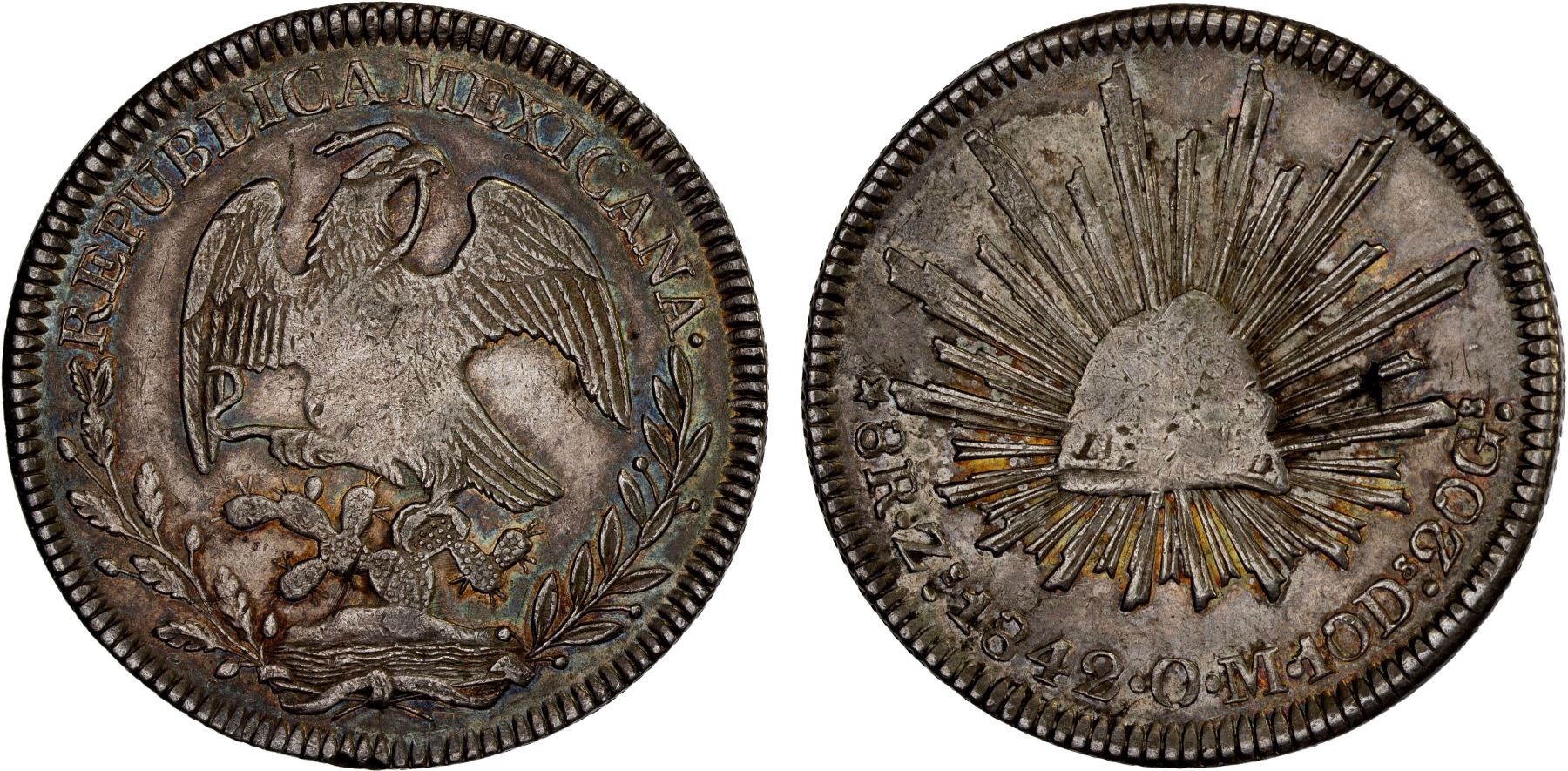 MEXICO: Republic, AR 8 reales (26.78g), Zacatecas, 1842-Zs, KM-377.13, D&P-Zs22, assayer OM, die style of 1842-45 with square tail, weak centers, reverse planchet flaw, attractive light tone, XF, ex Bob "Swamperbob" Gurney Collection.