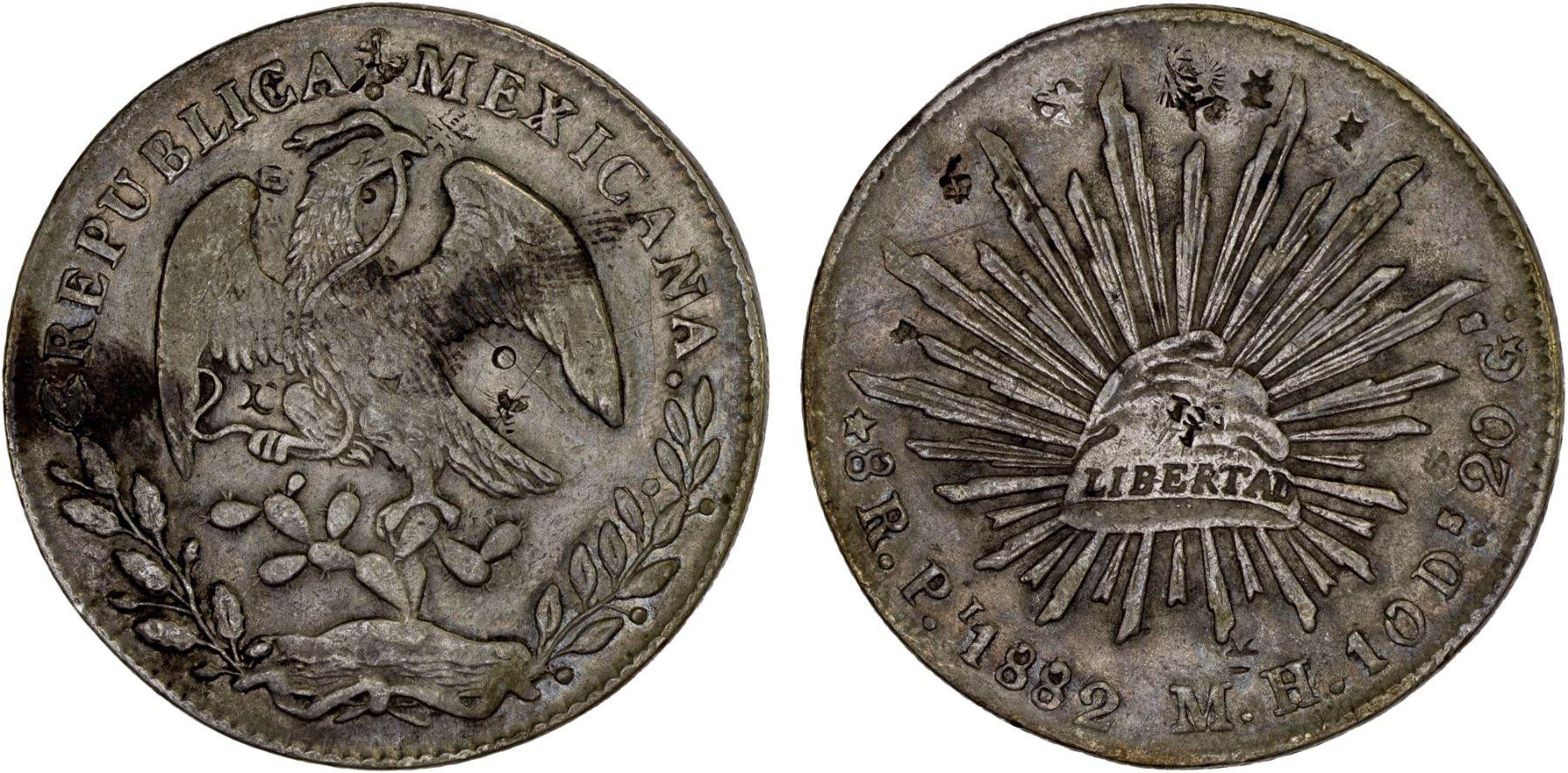 MEXICO: Republic, AR 8 reales (26.80g), 1882-Pi, KM-377.12, assayer JS, 8 over second 8 in date, unlisted in D&P, multiple small Chinese merchant chopmarks on both sides, a few obverse fingermarks, VF, ex Bob "Swamperbob" Gurney Collection.