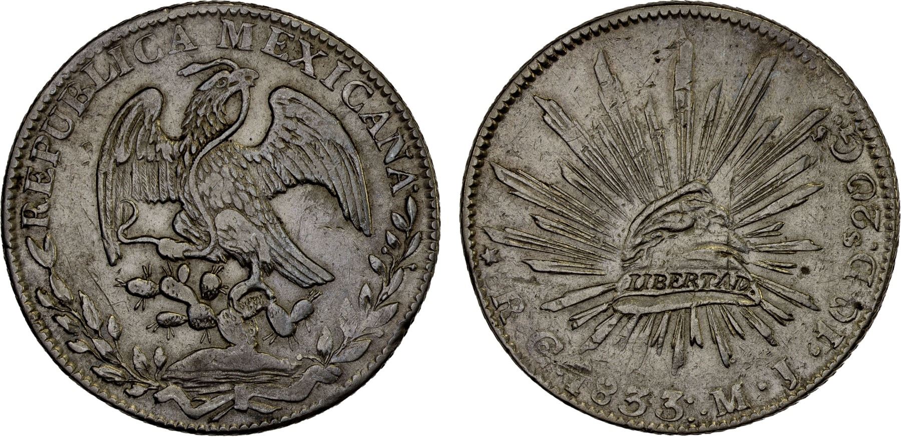 MEXICO: Republic, AR 8 reales (26.81g), 1833-Go, KM-377.8, D&P-Go14, assayer MJ, three dots after date, straight J, irregular edge, 1/1 in date, a few small scratches, VF-XF, ex Bob "Swamperbob" Gurney Collection.