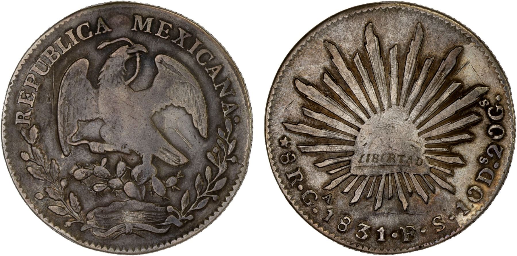 MEXICO: Republic, AR 8 reales (26.83g), 1831-Ga, KM-377.6, D&P-Ga09, assayer FS, rare date/mintmark/assayer, somewhat soft centers, two small obverse field scratches, toned, F-VF, ex Bob "Swamperbob" Gurney Collection. Most of this issue was sent to the Philippines and was countermarked.