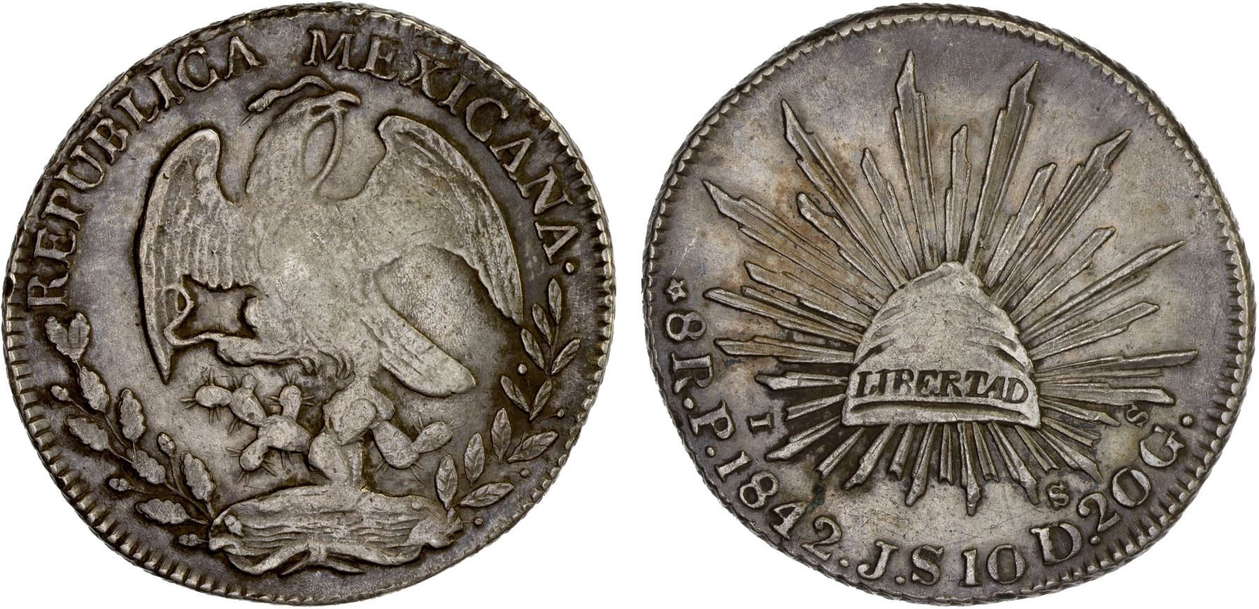 MEXICO: Republic, AR 8 reales (26.83g), San Luis Potosi, 1842-Pi, KM-377.12, D&P-Pi17, assayer JS, ray matrix pattern #2 (star below short ray 26), light oxidation, lightly cleaned, retoning, oblong flan, scarce date/assayer (scarcer than PS assayer), XF, ex Bob "Swamperbob" Gurney Collection. The I superscript on the mintmark is very high.
