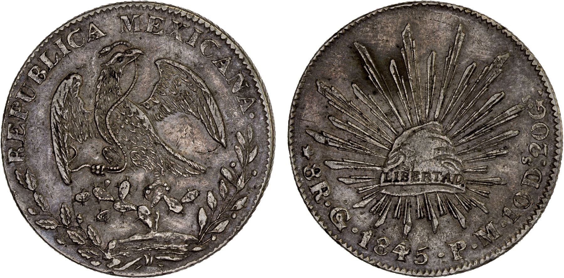 MEXICO: Republic, AR 8 reales (26.84g), Guanajuato, 1845-Go, KM-377.8, D&P-Go28, assayer PM, rare single die variety with cap of 1845, eagle is a revised engraving altering the standard #4 eagle, toning blotch on reverse, XF, ex Bob "Swamperbob" Gurney Collection.