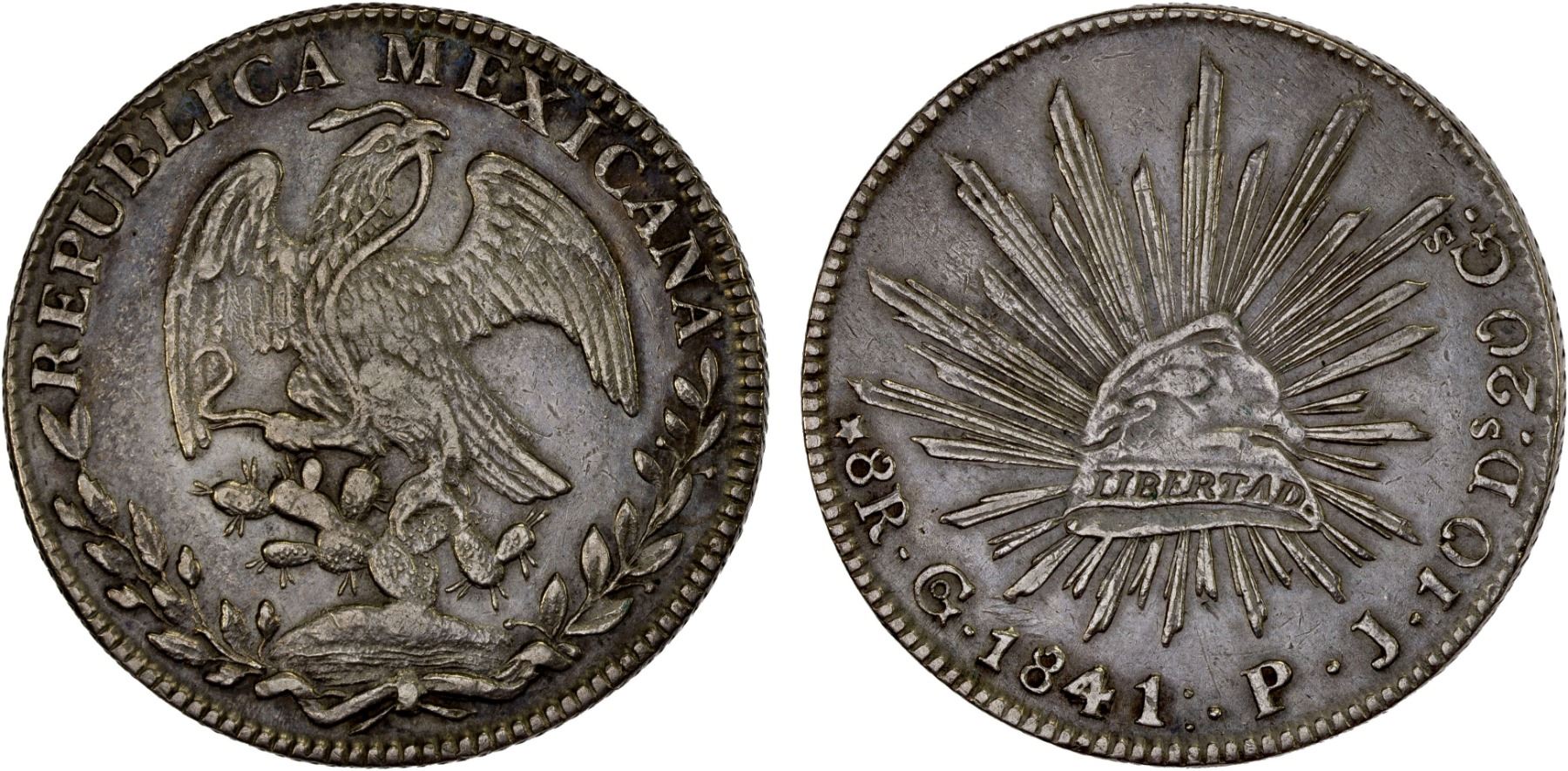 MEXICO: Republic, AR 8 reales (26.85g), 1841-Go, KM-377.8, D&P-Go23, assayer PJ, 4 in date is triple-punched, doubling of certain obverse features (most problem on the tail of the snake), but other elements are not doubled, a few small tooling marks near first "1" of date, VF-XF, ex Bob "Swamperbob" Gurney Collection. According to the consignor, the fact that only some features on the eagle and snake are doubled, but not others proves that Guanajuato was not using a full hub in 1841, and that some of the elements were added with a King Punch. The cactus and legend are not doubled. Hence, this is a very important discovery typel.