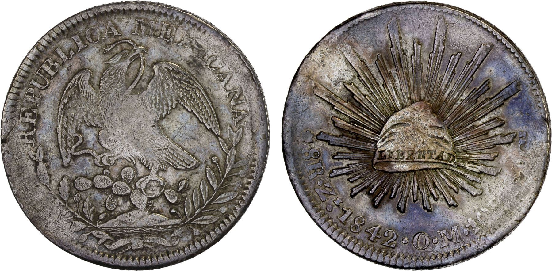 MEXICO: Republic, AR 8 reales (26.85g), Zacatecas, 1842-Zs, KM-377.13, D&P-Zs22, assayer OM, die style of 1825-42 with rounded tail, somewhat irregular flan, lightly cleaned, retoning somewhat unevenly, some weakness in the margins, soft eagle center, X/M in reverse legend, unlisted in D&P, medal alignment, very rare variety, XF, ex Bob "Swamperbob" Gurney Collection.