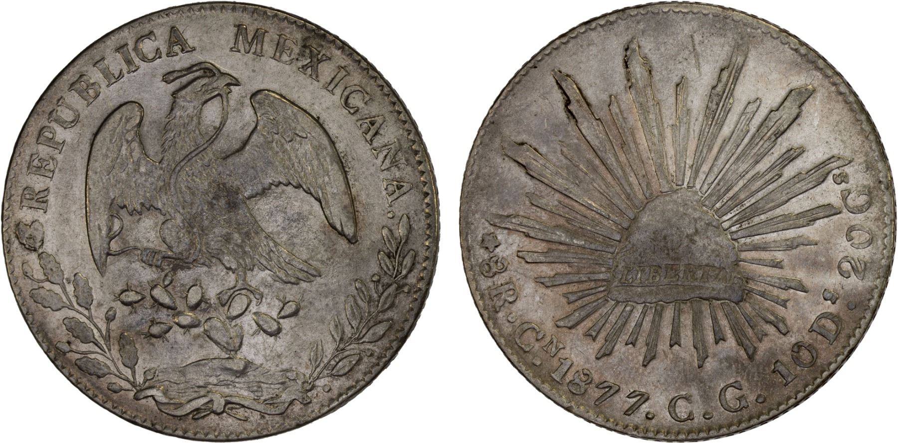 MEXICO: Republic, AR 8 reales (26.86g), 1877-Cn, KM-377.3, assayer GC, normal mintmark, lightly cleaned, VF-XF, ex Bob "Swamperbob" Gurney Collection.
