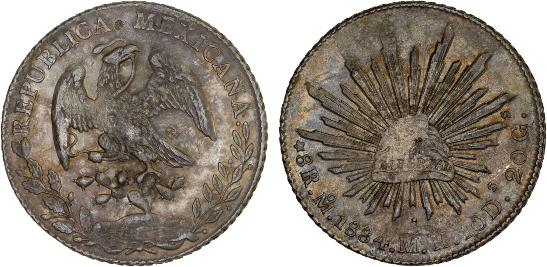 MEXICO: Republic, AR 8 reales (26.86g), 1884-Mo, KM-377.10, assayer MH, a few small Chinese merchant chopmarks on both sides, nice light tone, XF, ex Bob "Swamperbob" Gurney Collection.