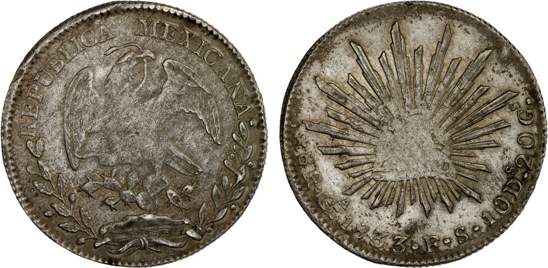 MEXICO: Republic, AR 8 reales (26.86g), Guadalajara, 1833-Ga, KM-377.6, D&P-Ga11, assayer FS, lightly cleaned, weak centers, scarce date/assayer, XF, ex Bob "Swamperbob" Gurney Collection.